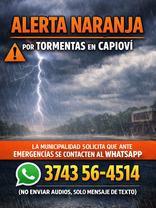 AGENCIA MISIONES.UNO | La Municipalidad de Capioví emitió una alerta naranja por tormentas que afectarán la región desde la madrugada del martes 7 de abril, con lluvias intensas, ráfagas fuertes y posible caída de granizo.