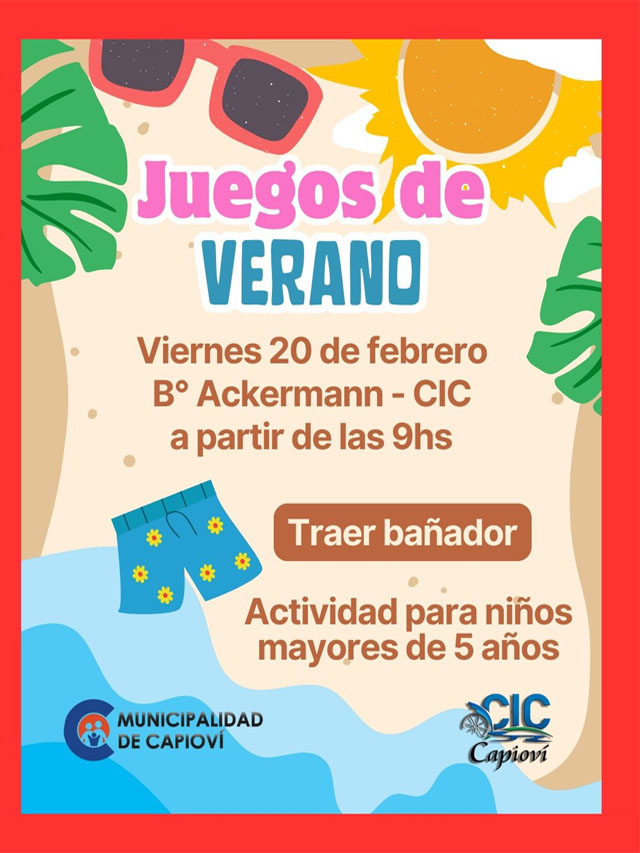 AGENCIA MISIONES.UNO | Este viernes 20 de febrero se realizarán los “Juegos de Verano” en el CIC del Barrio Ackermann de Capioví. La actividad comenzará a las 9:00 horas y está destinada a niños y niñas mayores de 5 años.