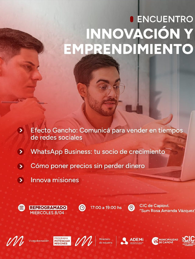 AGENCIA MISIONES.UNO | El próximo miércoles 8 de abril, a partir de las 17.00 horas, se realizará en el CIC de Capioví el Encuentro de Innovación y Emprendimiento, una propuesta libre y gratuita orientada a brindar herramientas prácticas para fortalecer iniciativas locales.